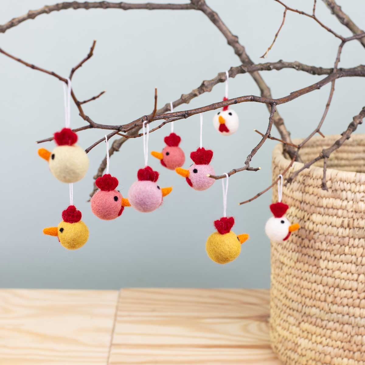 Disse små, farverige påskekyllinger er perfekte til at skabe en legende og forårsfrisk stemning i hjemmet. Hver kylling er nænsomt formet i hånden af blød, håndfiltet uld, og de søde detaljer – små næb, runde kroppe og den karakteristiske røde hanekam – giver dem et charmerende og livligt udtryk.