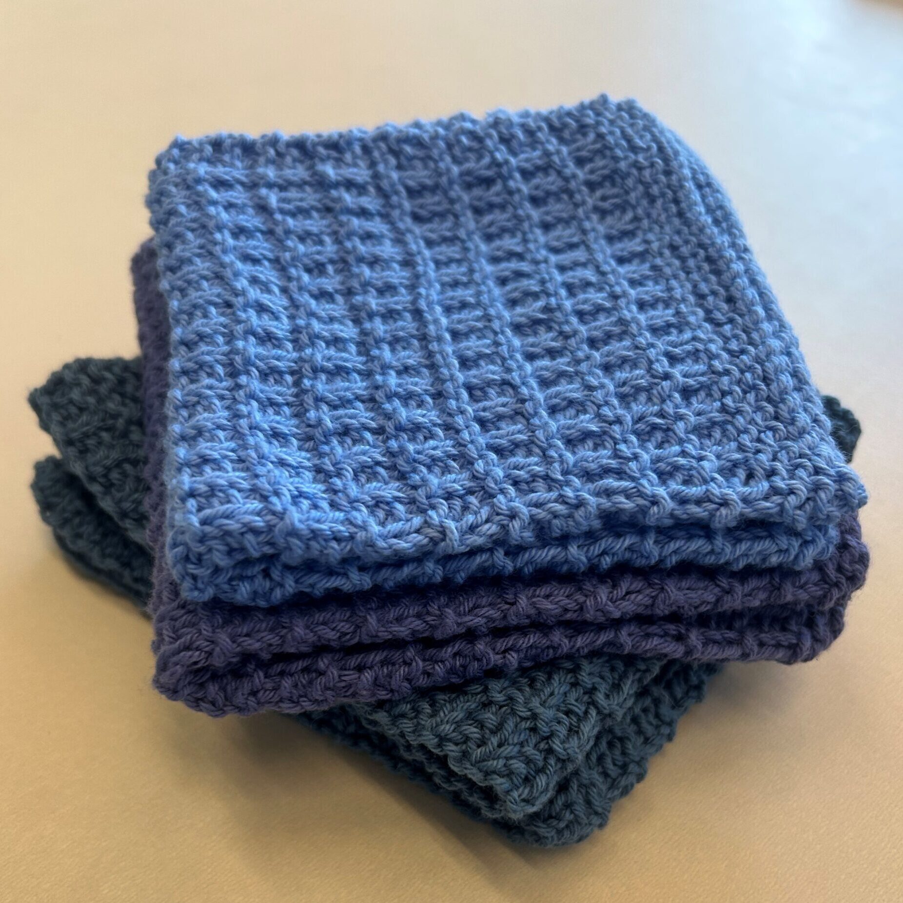 Flotte, hjemmestrikkede karklude. Uspec. farver og mønstre. Ca. 25 x 25 cm.